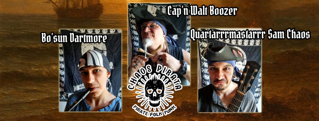 Dalle aspre coste dei fiumi e dei laghi del nord-ovest d’Italia salpa una ciurma legata da sangue e salsedine. Chaos Pirata è una Family Pirate Folk Band, formata da padre e due figli, che canta le proprie originali canzoni dei Sette Mari impastate di rum, tempesta e ribellione.